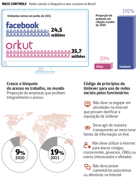 Mundo afora, a proibição vem aumentando. Segundo pesquisa global da consultoria de segurança on-line Clearswift, divulgada há duas semanas, cresceu a proporção das empresas que bloqueiam integralmente o acesso a redes sociais no trabalho -de 9% em 2010 para 19% em 2011. Outras 56% bloqueiam parcialmente, hoje.